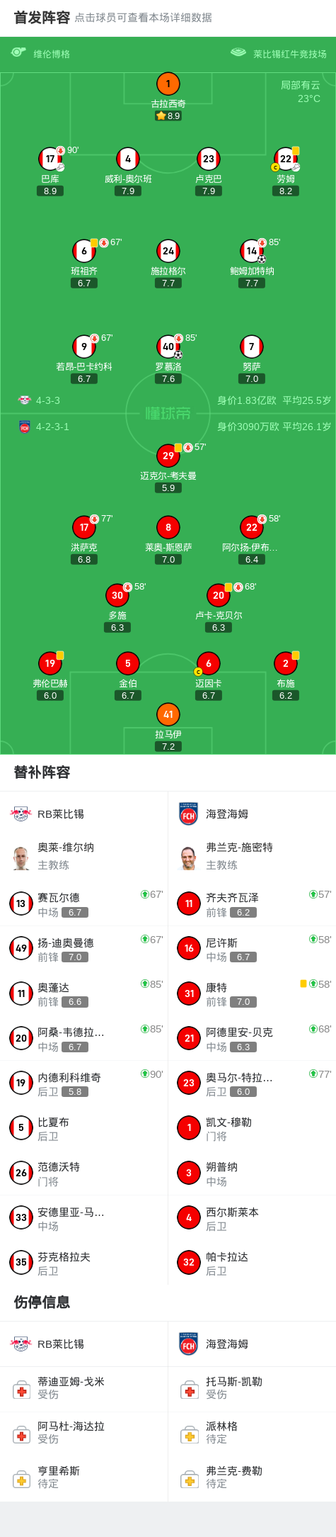 北京时间8月30日德国足球顶级联赛 联赛 第2轮,RB莱比锡主场对阵海登海姆。RB莱比锡鲍姆加特纳破门,罗慕洛破门。最终比分RB莱比锡 2-0 海登海姆。